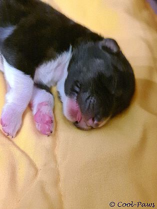 Die kleine Maus war von Anfang an aktiv und hat sich nach dem Reinigungsprozedre von Lara gleich auf den Weg zur Tzitze gemacht. Nur leider hat sie diese immer verpasst ;) Entweder war sie links daneben oder rechts daneben am Saugen. Das war sehr lustig, aber dann nach ein paar Versuchen hat sie es hinbekommen. Wie stark Welpen schon saugen können, sah man später sehr gut. Links und rechts von der Tzitze hatte Lara 2 dicke "Knutschflecke".Silja ist eine wunderschöne Black Tri Hündin mit ganz wenig weiß in ihrem Gesicht, keinen Kragen sondern einen zarten Strich im Nacken.